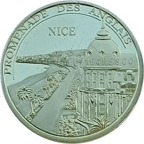 Text in the periphery. View of the Negresco hotel and the Promenade des Anglais. |