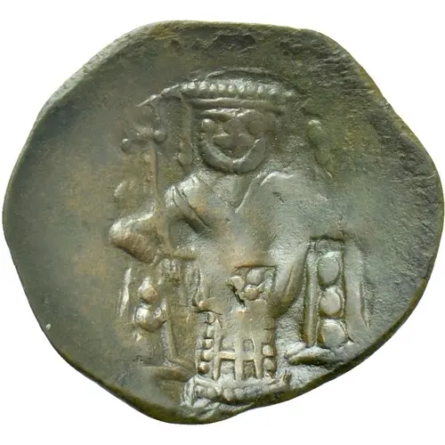 Technical/Grading: As a copper Trachy, this coin exhibits characteristics typical of its fabric and material. High-points susceptible to wear or weak strike include Christ's halo, facial features, and the emperor's crown and raised hand. The cup-shaped flan often resulted in uneven metal distribution during striking, leading to off-center strikes, areas of flatness, and incomplete legends. Flan cracks and surface pitting are also common due to the inherent properties of the copper and the striking process, impacting overall preservation and detail.