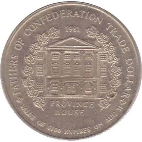 | Reverse lettering | FATHERS OF CONFEDERATION TRADE DOLLAR 1981 PROVINCE HOUSE VALUE OF $1.00 EXPIRES ON AUG 31 |