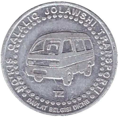| Obverse lettering | NO`KIS QALALIQ JOLAWSHI TRANSPORTI TZ .DAVLAT BELGISI DICHB • |