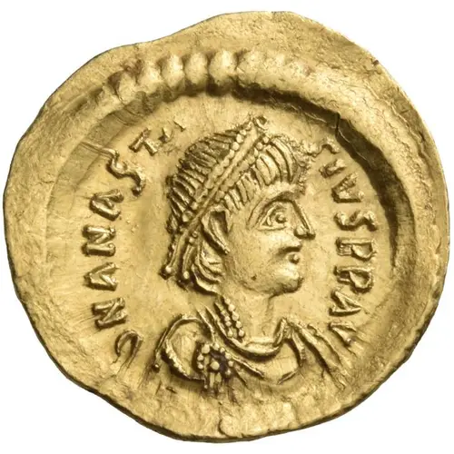 | Opis awersu | Emperor Anastasius I Dicorus (pearl diademed, draped, cuirassed bust right) |