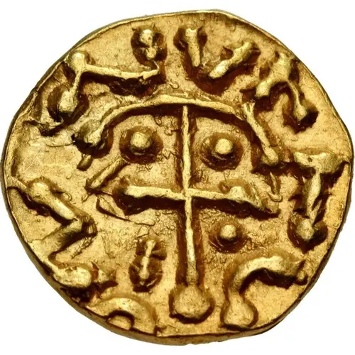 Historical Context: This Tremissis from Clermont-Ferrand (Arvernis) dates to the Merovingian period (560-680 AD), spanning the reigns of various Frankish kings. The Frankish realm, though often fragmented, relied on gold coinage for high-value transactions. Clermont-Ferrand was a significant regional mint, reflecting the decentralization of power after Roman decline. These coins were vital for economic stability and asserting local sovereignty in a post-Roman Europe, serving as the primary gold currency for commerce and tribute across the Merovingian territories.