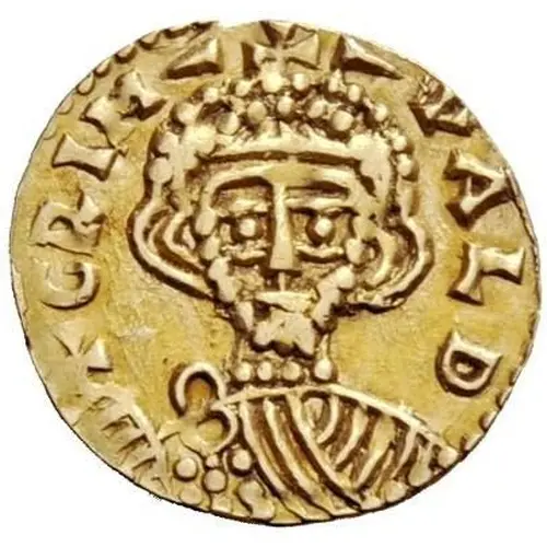 | Descrição do anverso | Crowned, draped, and bearded bust holding cross and surrounded by legend. |