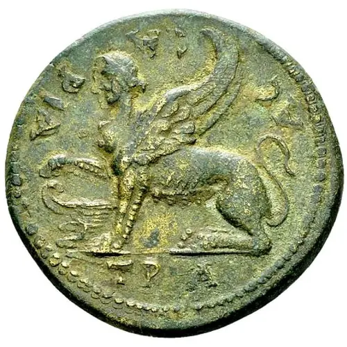 | Descrizione del dritto | Sphinx seated left, lifting right paw over prow of galley. |