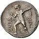 Descripción del reverso Phemios, as a slinger, nude but for chlamys over his shoulder and sword on baldric, standing facing, head turned to right, shooting his sling to right. Behind him, two spears leaning against his right leg and to right, trophy