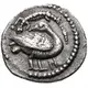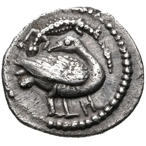 Descripción del anverso Goose standing towards the right, head facing left and above it, a lizard curving towards the left. Letter H to lower right.