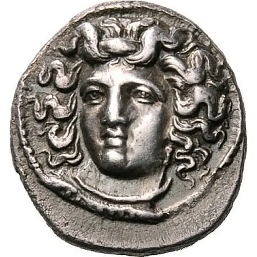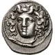 | Obverse description | Head of the nymph Larissa facing, turned slightly to the left, wearing ampyx, pendant earring, and simple necklace |
