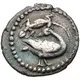 Descripción del anverso Goose standing and facing right with its head facing left. A lizard above and a beaded ring around all.