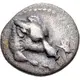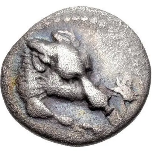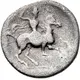 | Reverse description | Helmeted male figure on horseback prancing right, its chiton billowing behind, spear in its raised right. |