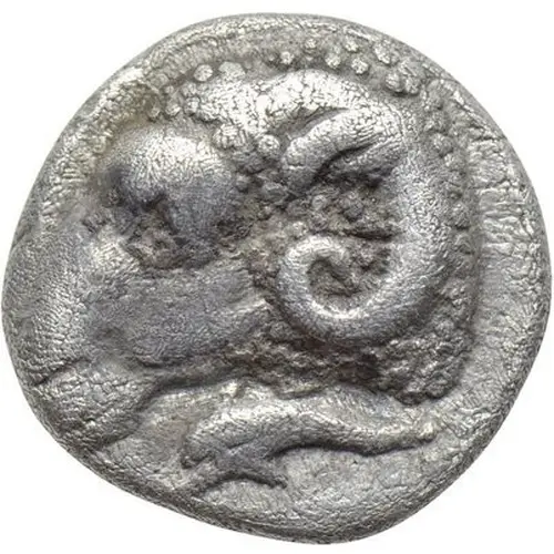 | Reverse description | Head of goat facing; dolphins swimming downwards left and right; all within incuse circle. |