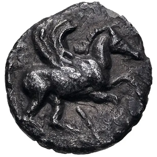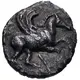 توضیحات روی سکه Pegasus flying towards the right, pilos to the upper left and a club below