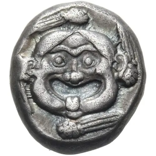 | Descrizione del dritto | Facing gorgoneion with protruding tongue and four wings evenly spaced around. |