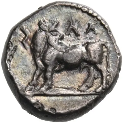 | 表面の説明 | Man-headed bull standing to left or right, his head turned back. |