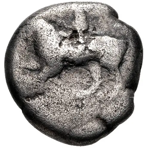 | Reverse description | Dove flying right, inverted san above head, inverted T (= τριώβολον) below and all within incuse square |