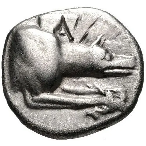 | Description du revers | Large A; magistrate’s name across field, below trident; all within incuse square. |