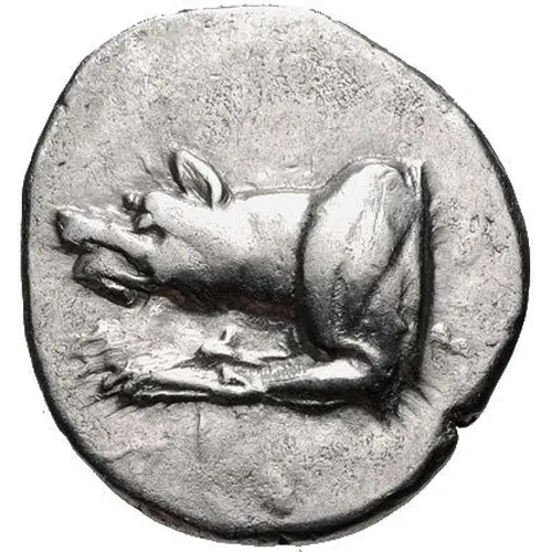 | Descrizione del rovescio | Large A; below, boar’s head right; magistrate’s name across field; all within incuse square. |