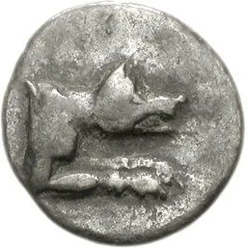 | توضیحات روی سکه | Forepart of wolf at bay to right. |