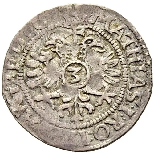 MATHIAS : I : RO IM S AVG F DEC 3 (Translation: Matthias I, emperor of the Romans, always august, by decree. 3 [Kreuzer].) |