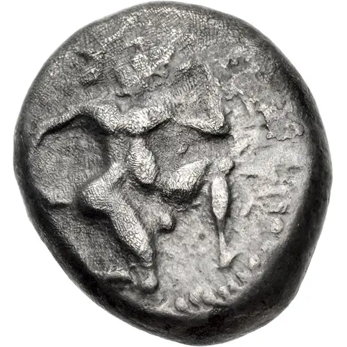 | Obverse description | Satyr in running-kneeling position right; dotted border. |
