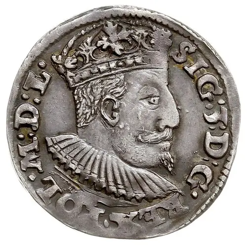 GROS : ARG TRIP : REG POLONIAE I (_) F 9 (_) 5 (Translation: Silver three grossus of the Kingdom of Poland.) |