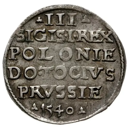 | Obverse lettering | ⁕ III ⁕ SIGIS · I · REX POLONIE DO · TOCIVS PRVSSIE ⁕ 1540 ⁕ (Translation: 3 Groszy Sigismun I, King of Poland, Lord of all Prussia) |