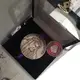 The old emblem of the United Arab Emirates; which consists of a falcon of Saladin. The falcon has a disk which shows an Arab sailboat in its interior. The disk is surrounded by a chain. The falcon holds with its talons a parchment bearing the name of the federation in Kufic script |