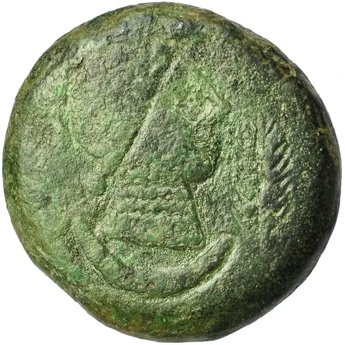 | Aversbeschreibung | Female head facing right with hair tied in a bun. Palm leaf to the right. Crescent below. |