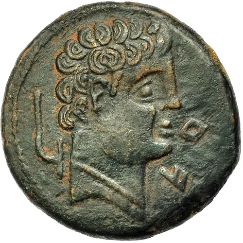 توضیحات روی سکه Male head facing right, wearing necklace, with hair formed of concentric arches. Plow to the left.