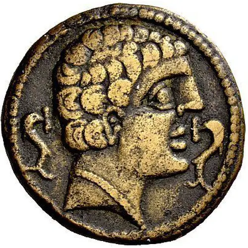 | Описание аверса | Male head facing right wearing pearl necklace. Two dolphins to the left and right. |