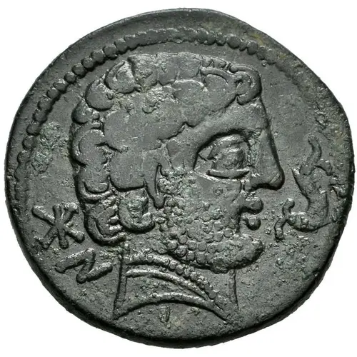 | 表面の説明 | Bearded male head facing right, wearing beaded collar. Dolphin to the right. |