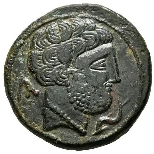 | Opis awersu | Bearded male head facing right, wearing necklace; dolphin before. |
