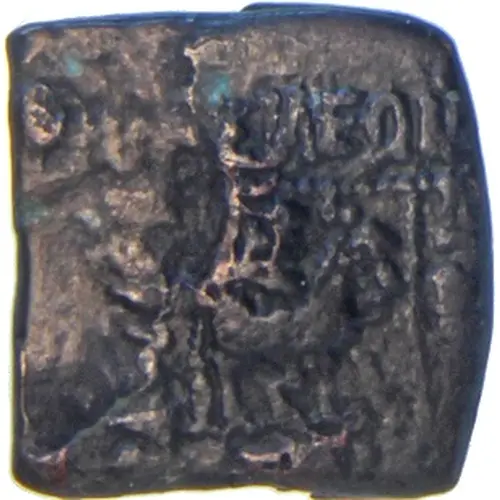 | Ön yüz açıklaması | King mounted on horse right, Kharoshthi ti above, within square border, Greek legend around |