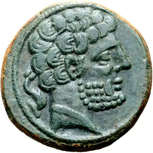 | Aversbeschreibung | Bearded male head facing right, wearing beaded collar. Dolphin facing downwards behind. |