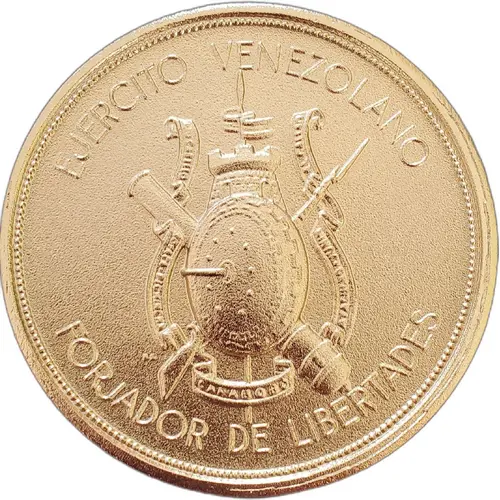 | Opis awersu | In the middle of the piece is a large emblem of the Venezuelan Army, which includes depictions of a castle turret, a musket, a cannon, a shield, a spear, and a ribbon. |