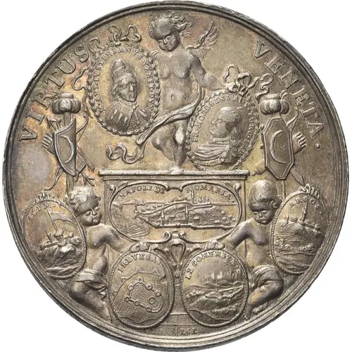 Reverse description The allegorical figure of Venice, winged and crowned, seated to the left, holds a palm branch, surrounded by five putti holding battle scene-plans.