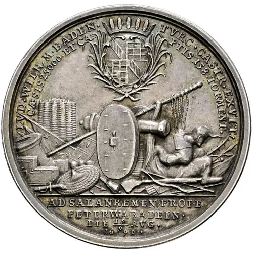 LVD.WILH.M.BADEN. TVRC.CASTR.EXVIT. CAESIS 25000.ET CA PTIS 258 .TORMENT. AD SALANKEMEN PROPE PETER WARADEIN. DIE 19/9 AVG. 1691 |