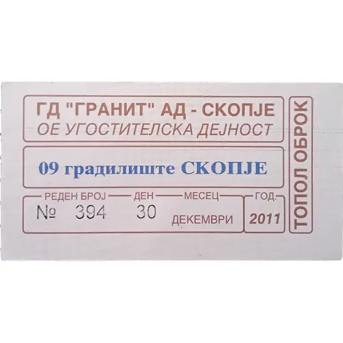 | Leyenda del anverso | ГД `ГPAHИT` АД - CKOПJE OE YГOCTИTEЛCKA ДЕЈHOCT 09 гpaдилиште CKOПJE PEДЕH БPOJ ДЕH MECEЦ ГОД No- 394 30 ДEКEMБPИ 2011 TOПОЛ OВPOК |