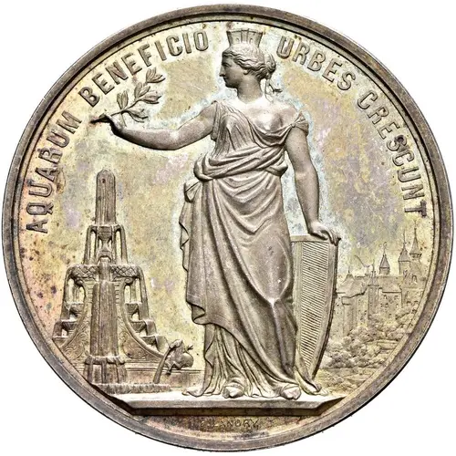 | Obverse lettering | AQUARUM BENEFICIO URBES CRESCUNT F. Landry (Translation: Thanks to the benefits of water, cities are growing.) |