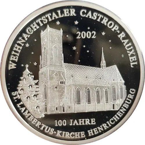| Obverse lettering | WEIHNACHTSTALER CASTROP-RAUXEL 2002 100 Jahre ST. LAMBERTUS-KIRCHE HENRICHENBURG (Translation: CHRISTMAS-TOKEN CASTROP-RAUXEL 2002 100 YEARS ST. LAMBERTUS-CHURCH HENRICHENBURG) |