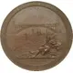 View of the wooden bridge Levensau with passing train, ships below and sun rays above. In the foreground Neptune leaning with his left arm on a rock. |