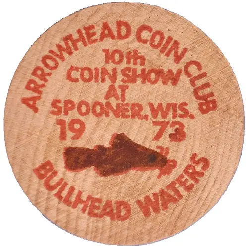 | Obverse lettering | ARROWHEAD COIN CLUB 10th COIN SHOW AT SPOONER, WIS 1973 BULLHEAD WATERS |
