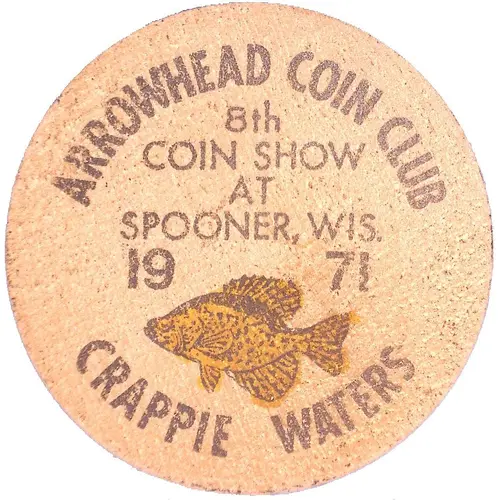 | Ön yüz lejandı | ARROWHEAD COIN CLUB 8th COIN SHOW AT SPOONER, WIS 1971 CRAPPIE WATERS |
