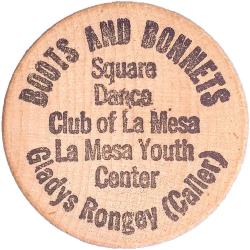 | Obverse lettering | BOOTS AND BONNETS Square Dance Club of La Mesa La Mesa Youth Center Gladys Rongey ( Caller) |