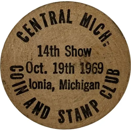 | Obverse lettering | CENTRAL MICH. 14th Show Oct. 19th 1969 Ionia, Michigan COIN AND STAMP CLUB |