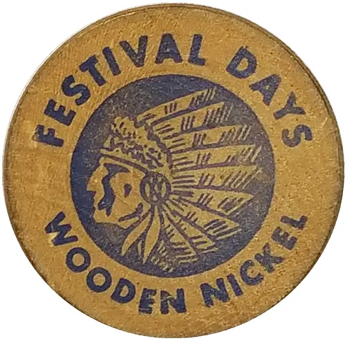 | Obverse lettering | FESTIVAL DAYS WOODEN NICKEL |