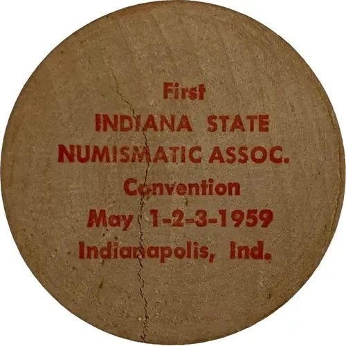 | Obverse lettering | First INDIANA STATE NUMISMATIC ASSOC. Convention May 1-2-3-1959 Indianapolis, Ind. |