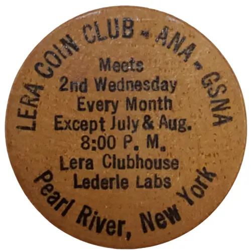 | Obverse lettering | LERA COIN CLUB - ANA - GSNA Meets 2nd Wednesday Every Month Except July & Aug. 8:00 P. M. Lera Clubhouse Lederle Labs Pearl River, New York |