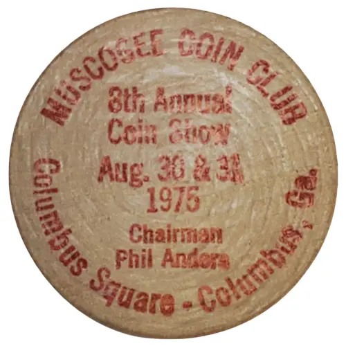| Obverse lettering | MUSCOGEE COIN CLUB 8th Annual Coin Show Aug. 30 & 31 1975 Chairman Phil Anders Columbus Square - Columbus, Ga. |