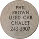 | Obverse lettering | PHIL BROWN USED CAR CHALET 243-3907 |