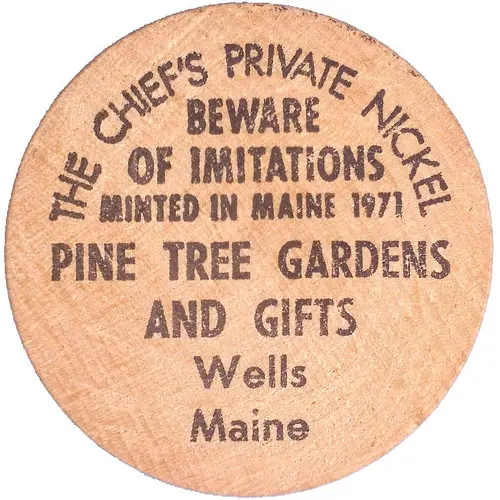 | Obverse lettering | THE CHIEF`S PRIVATE NICKEL BEWARE OF IMITATIONS MINTED IN MAINE 1971 PINE TREE GARDENS AND GIFTS Wells Maine |